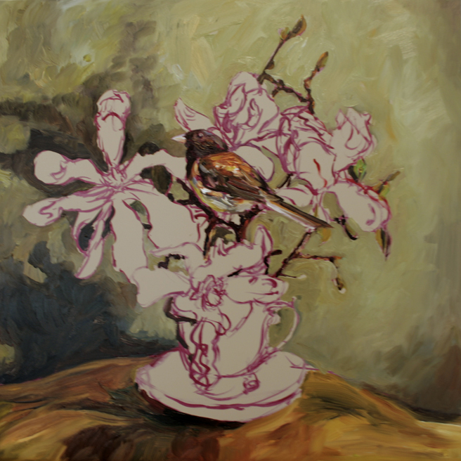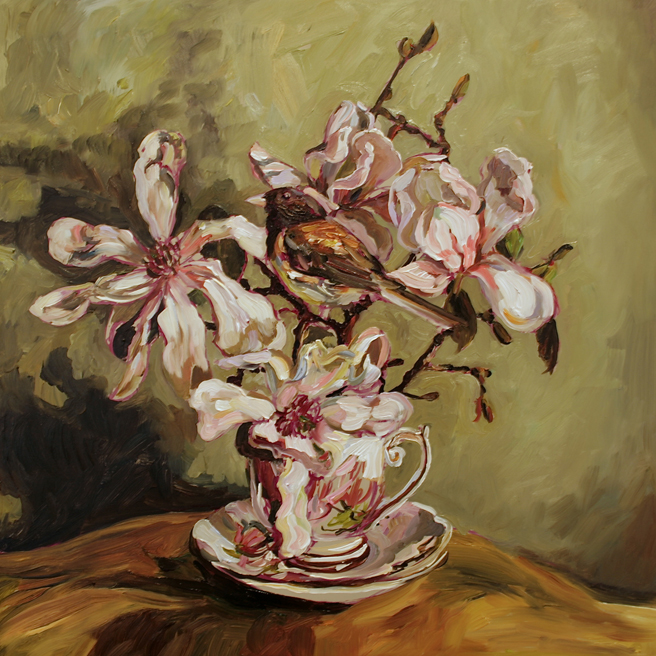 A new Bird & Teacup on the easel today! This time it’s one of the little Dark-eyed Junkos that are always underfoot. This one is nestled into some branches of Star Magnolia that my friend painter Isaias Sandoval had cut for me from his tree. I love the way it’s coming together!