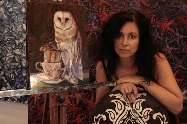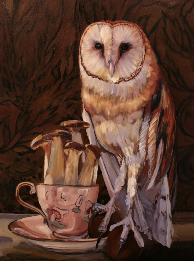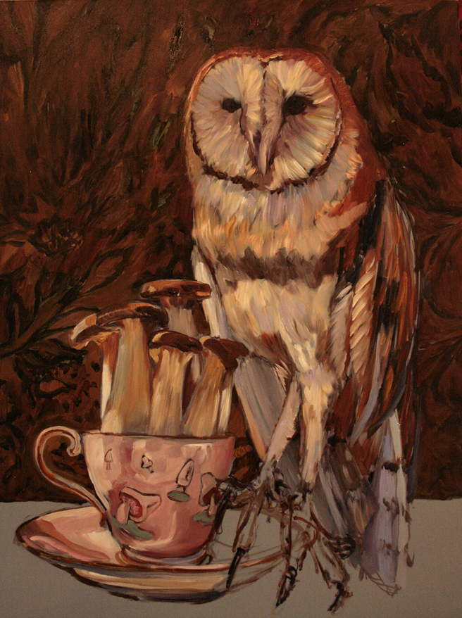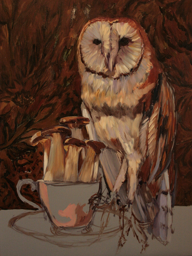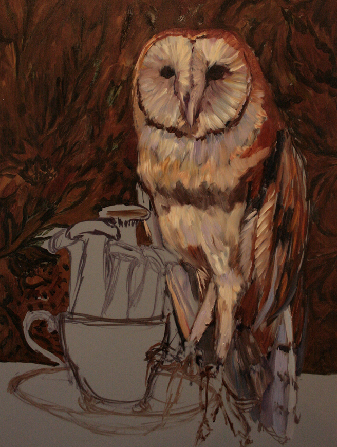 This week before Halloween seems a good a time as any to begin work on my barn owl. This bird, who goes by the name of Owlivia at the local Wildlife Education and Rehabilitation Center, is paired with an Aynsley teacup (circa 1939) filled with trumpet mushrooms. I love the woodland magic of this combination – now to try and do it some justice with paint!