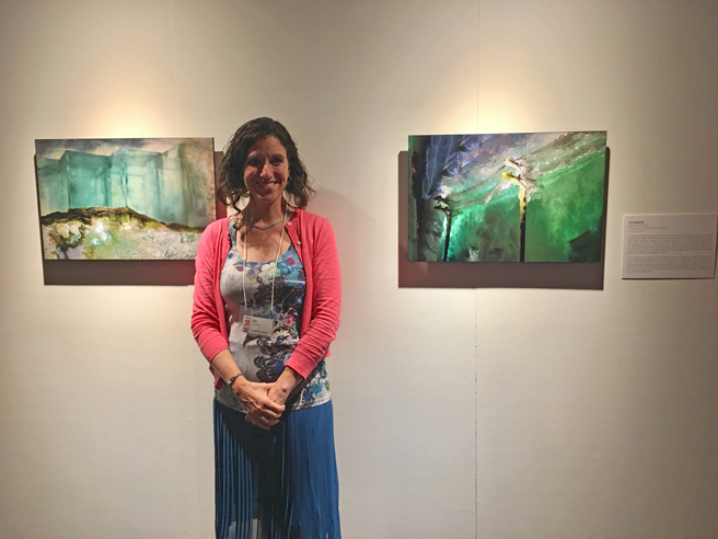 Linda Gass with her sumptuous painted silk textile pieces, Owens River Diversion and San Joaquin Merced Revival.
