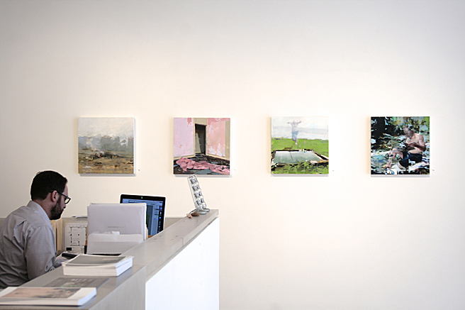 I’ve been following this artist’s oil paintings online for a year or two but this was the first time I got to see his work in person and I can say, without hesitation, that he is absolutely my favorite contemporary painter (and I’m kicking myself for not making his reception where I heard he gave a great talk)! There are so many virtuoso elements that make up his work. His figures and interiors seem to dissolve and reassemble before your eyes, as immaterial as ghosts and just as haunting! He uses exquisite color palettes, punctuated with vibrant stabs of pigment. There is often a segmented quality subtly dividing up the work, which for me, evokes a feeling of passing time. On top of all that there is a masterful, gestural looseness in the application of the paint that is pure genius!