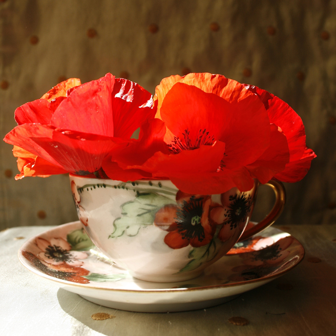 I love how these antique, eggshell thin, hand-painted teacups marked Germany and Nippon photographed in the early morning light with their requisite bouquet of freshly cut poppies! I better just pick a bird or two and get on with it … Cardinal, Red-winged Blackbird? The poppy speaks of oblivion in the Victorian language of flowers, I wonder how I will bring that into a Birds and Teacups piece?