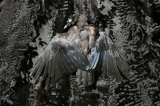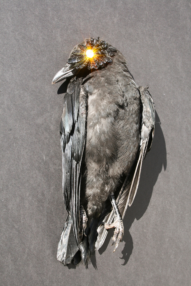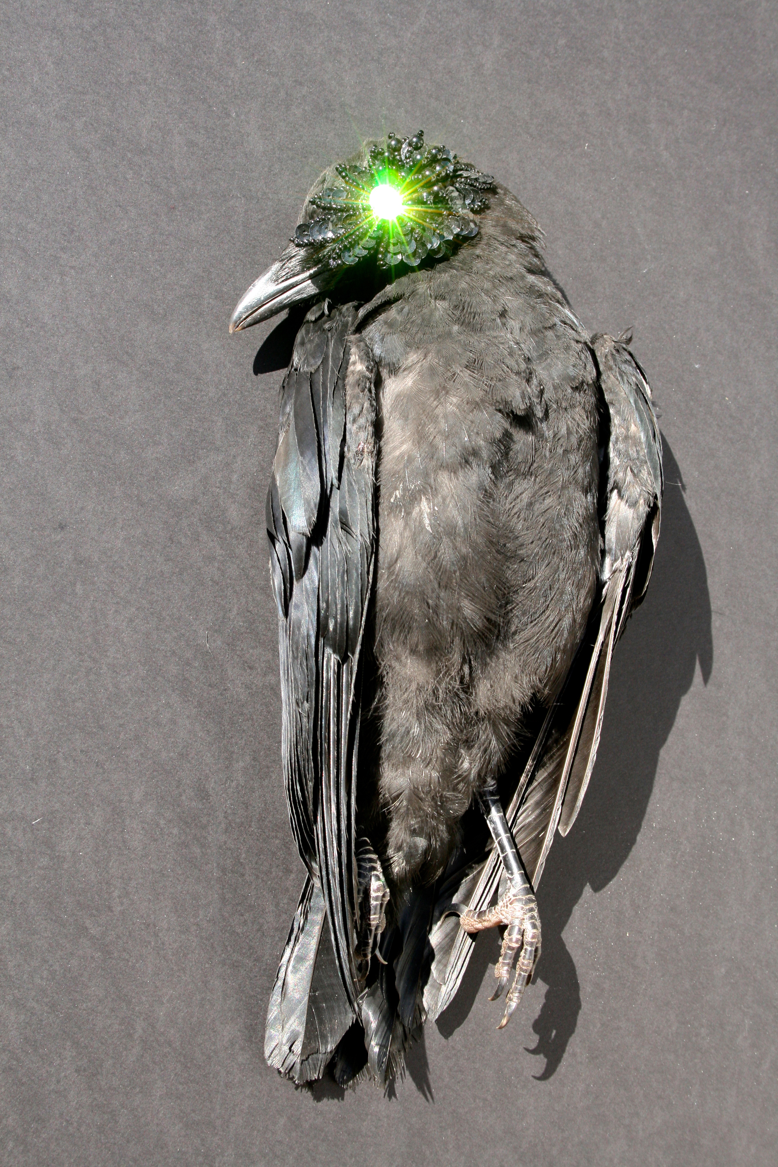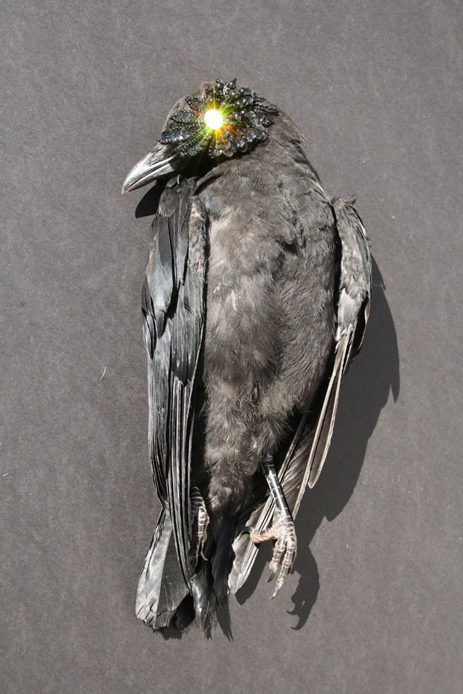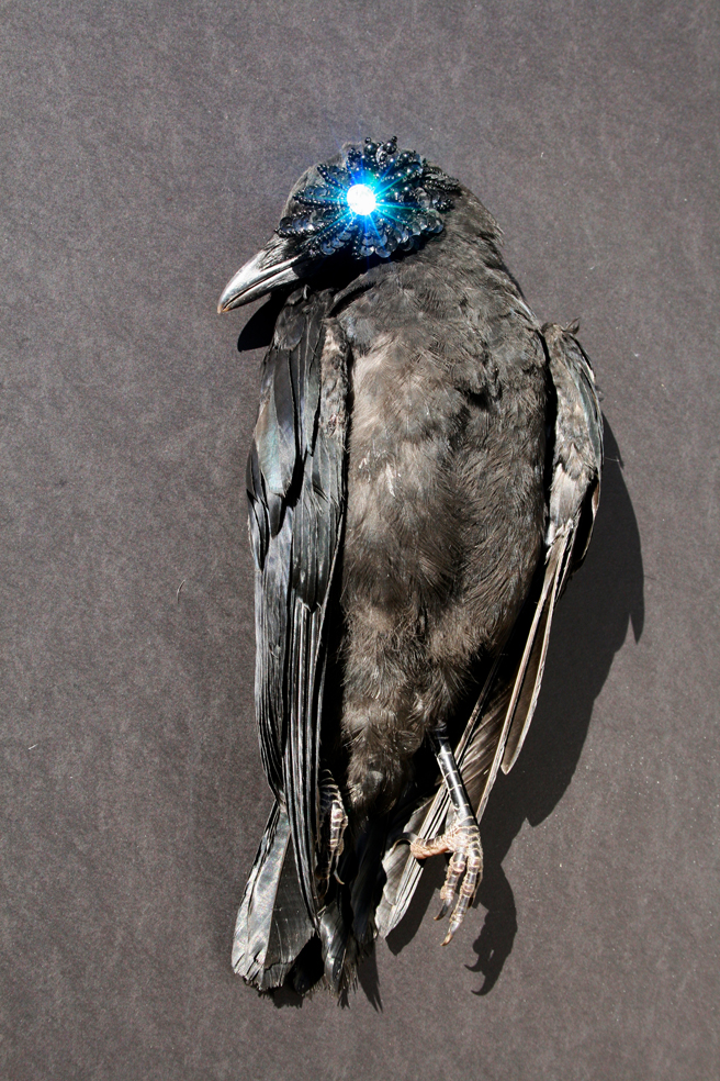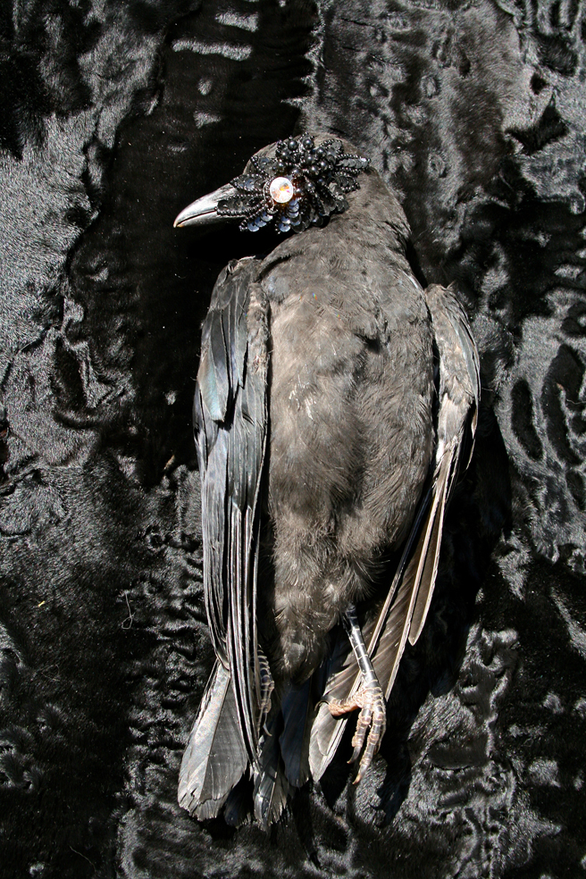 I’ve sculpted crows back in my art school days using leather and natural materials in a totemic stye and I’ve been recently re-inspired to try my hand at it again after being blown away by the magical work of British textile artist Mister Finch. I’ve gone so far as collecting materials for my Corpus Corvus sculptures I have in mind, vintage beaded Victorian lace, bits of jewelry, scapulars and reliquaries. The closed eyes of the crow I was photographing looked so sad that I laid one of my gathered bits over them.