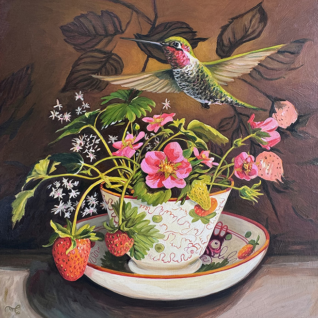 A gathering of hummingbirds is known as a charm, which nicely captures the feeling I’m aiming to evoke in all of my birds and teacups which I’ve been painting for over a decade. In echoing the the hand-painted imagery on the antique teacups with matching bouquets, I try to conjure a kind of surreal magic to entice wild birds into domestic settings. As a birding enthusiast, I’m always taking photographs which I import into my still-life arrangements through my computer to use as a painting reference. Birds have symbolized messengers throughout history and in these paintings, speak to the heartbreaking loss of 30 percent of our wild bird population within my lifetime alone! Somehow pairing these wild birds with the antique porcelain reminds me of another age, a quiet reminder of the beauty and wonder which maybe relegated to our past.